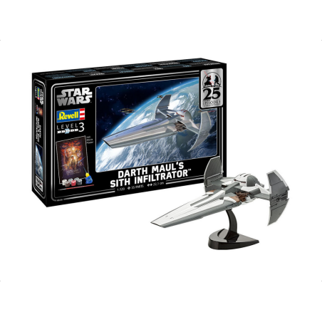 Le coffret cadeau Revell 1/120 Darth Maul's Sith Infiltrator de la gamme de modèles en plastique Star Wars recrée avec précision le vaisseau piloté par Darth Maul dans la franchise Star Wars. Ce set de démarrage contient les peintures et la colle essentielles nécessaires pour compléter la maquette.